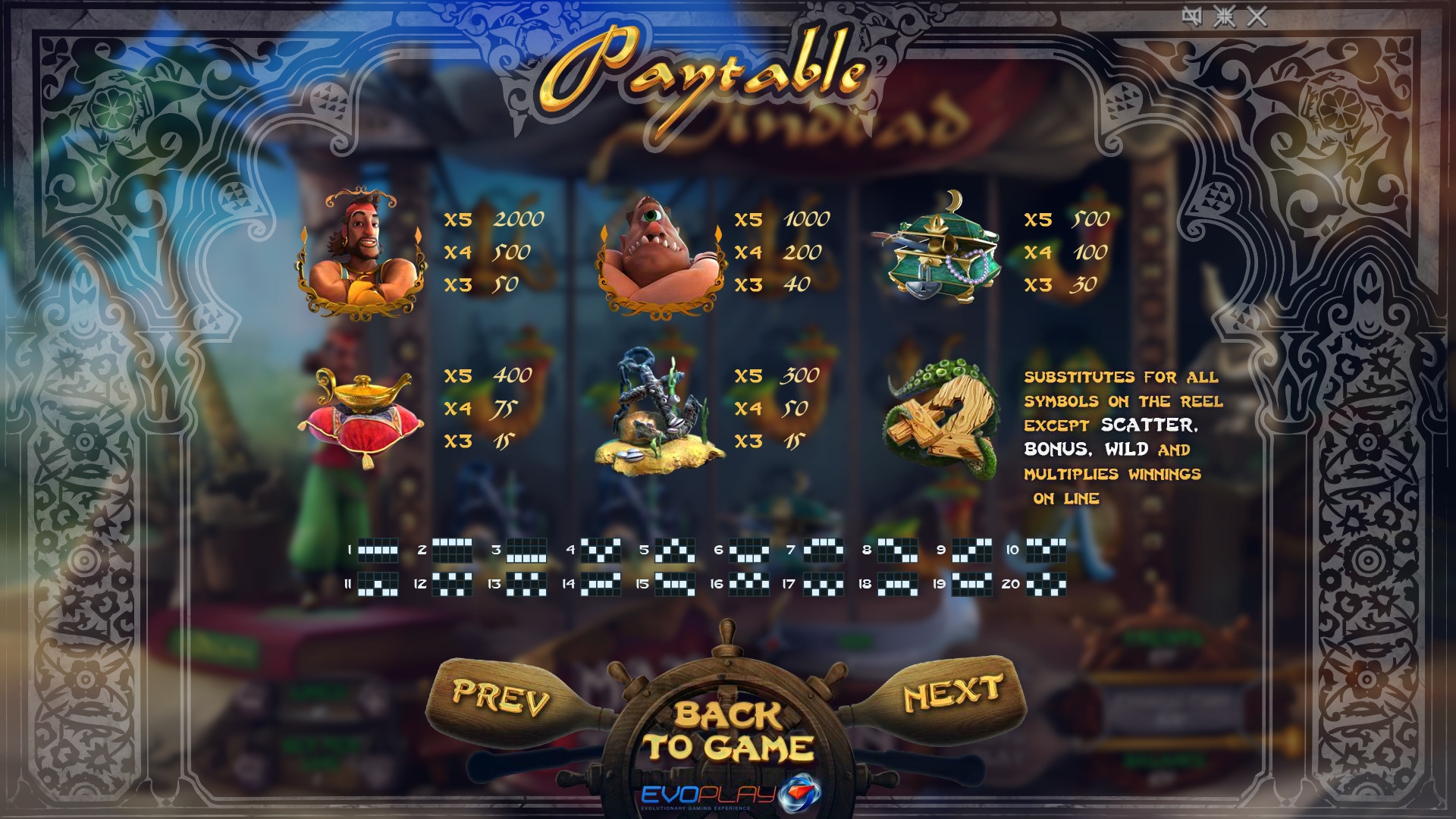 Sindbad – пятибарабанный игровой онлайн-автомат с двадцатью линиями и тремя рядами символов на основном экране. Разрешается задействовать одну, три, пять, девять, пятнадцать или двадцать полос для формирования на них выигрышных цепочек.