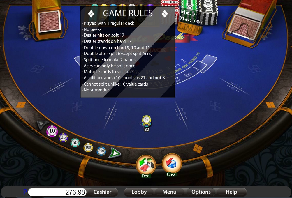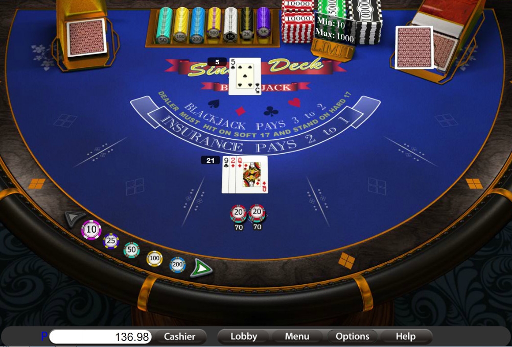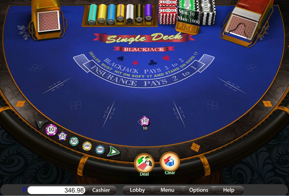 Играть в Single Deck Blackjack можно лишь на один бокс. Диапазон ставок – от десяти кредитов до одной тысячи.