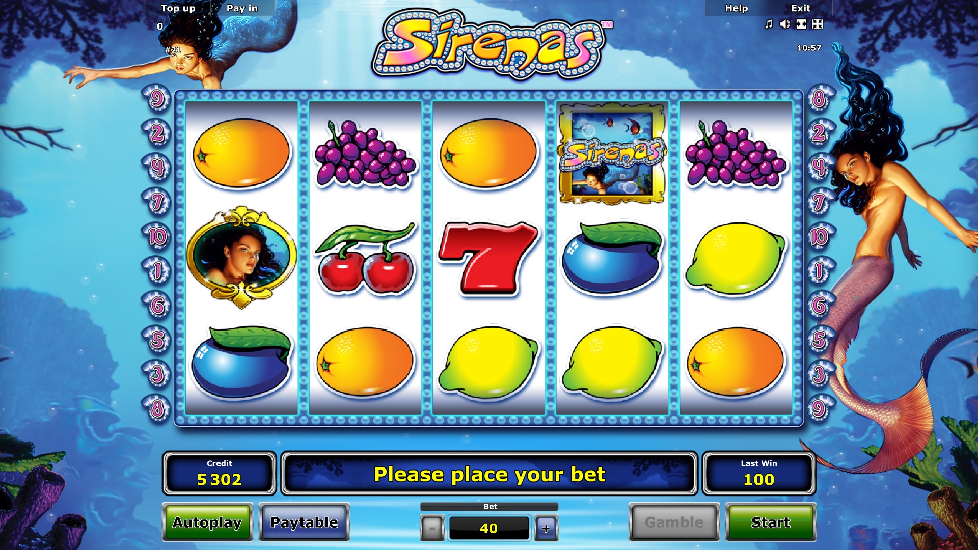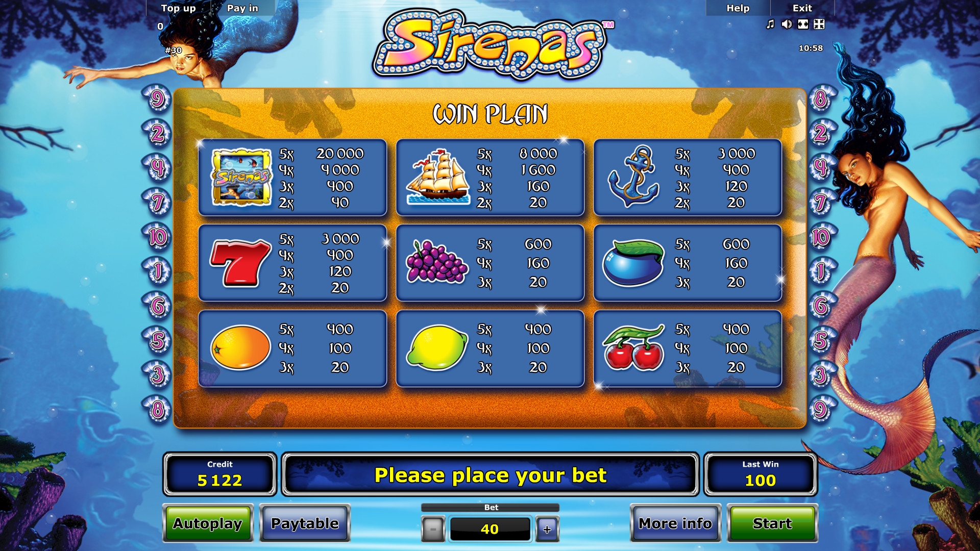 Выигрыши рассчитываются по ставке на линию и коэффициенту полученной цепочки. Он бывает в Sirenas от х5 до х5000. Эти величины перемножаются, а если комбинаций несколько, кредиты суммируются.