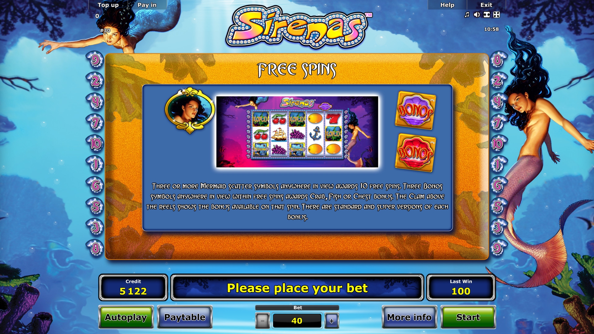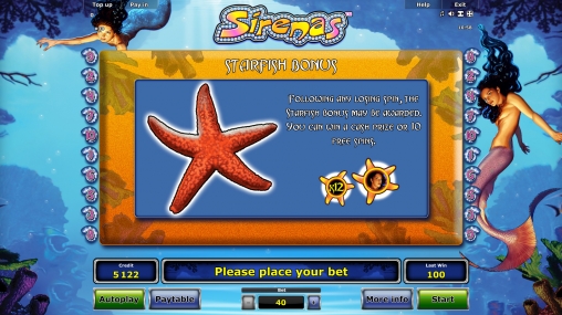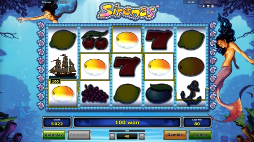 Sirenas – аппарат с пятью барабанами, десятью фиксированными линиями и пятнадцатью картинками на главном экране.