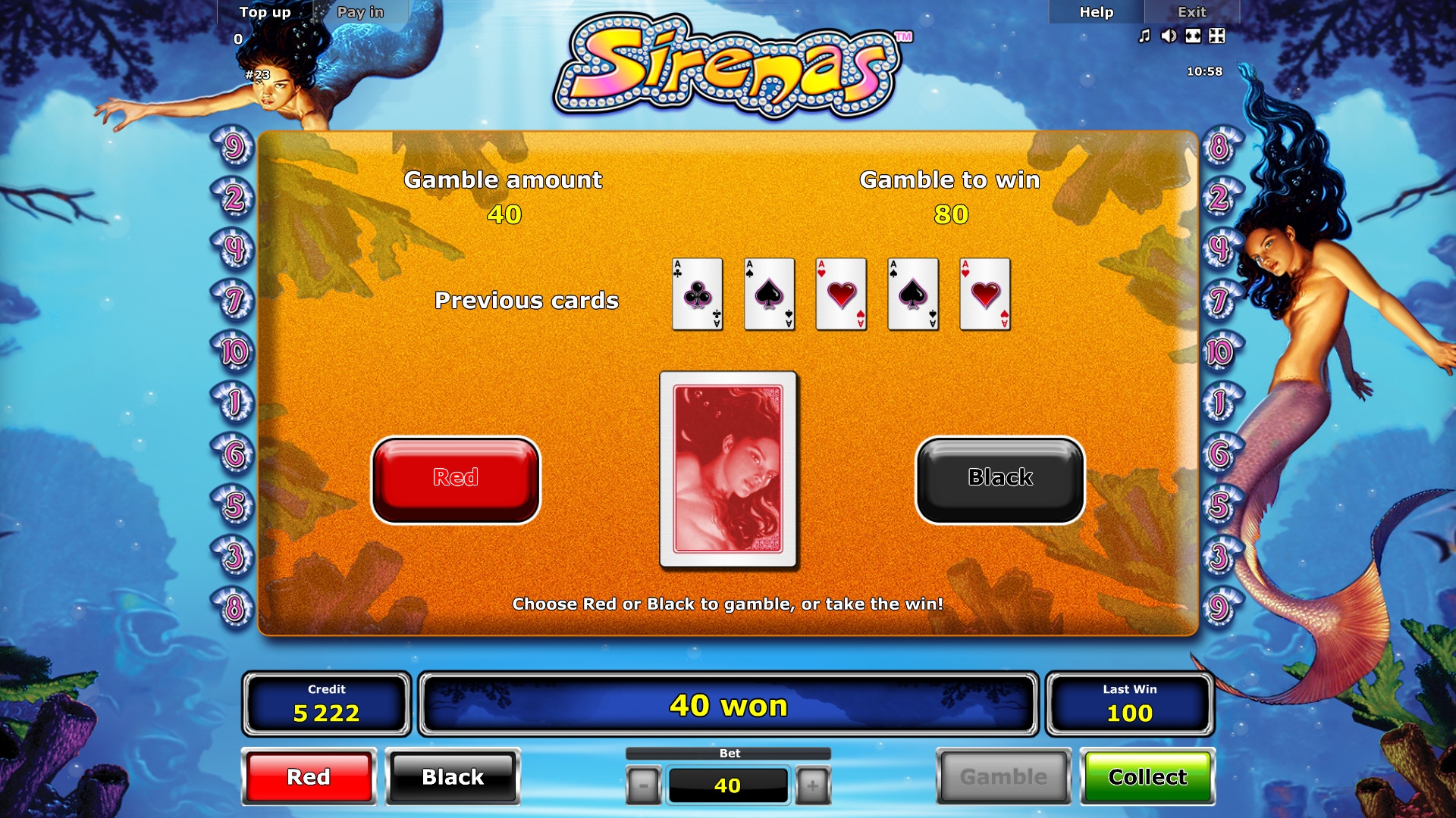 Есть игра по равным шансам, в которой нужно угадать цвет карты, чтобы выплата удвоилась. Клиенты принимаются в ней участие по своему желанию. Подряд можно играть до определенного лимита, но при ошибке деньги уходят в казино.
