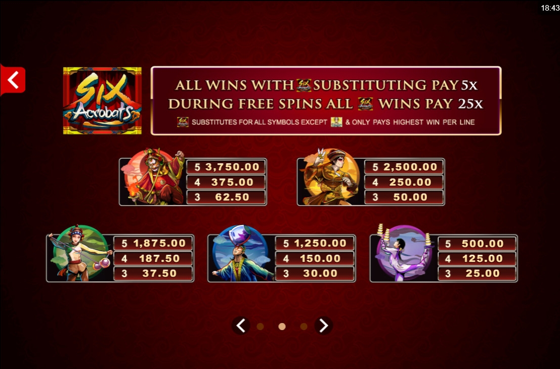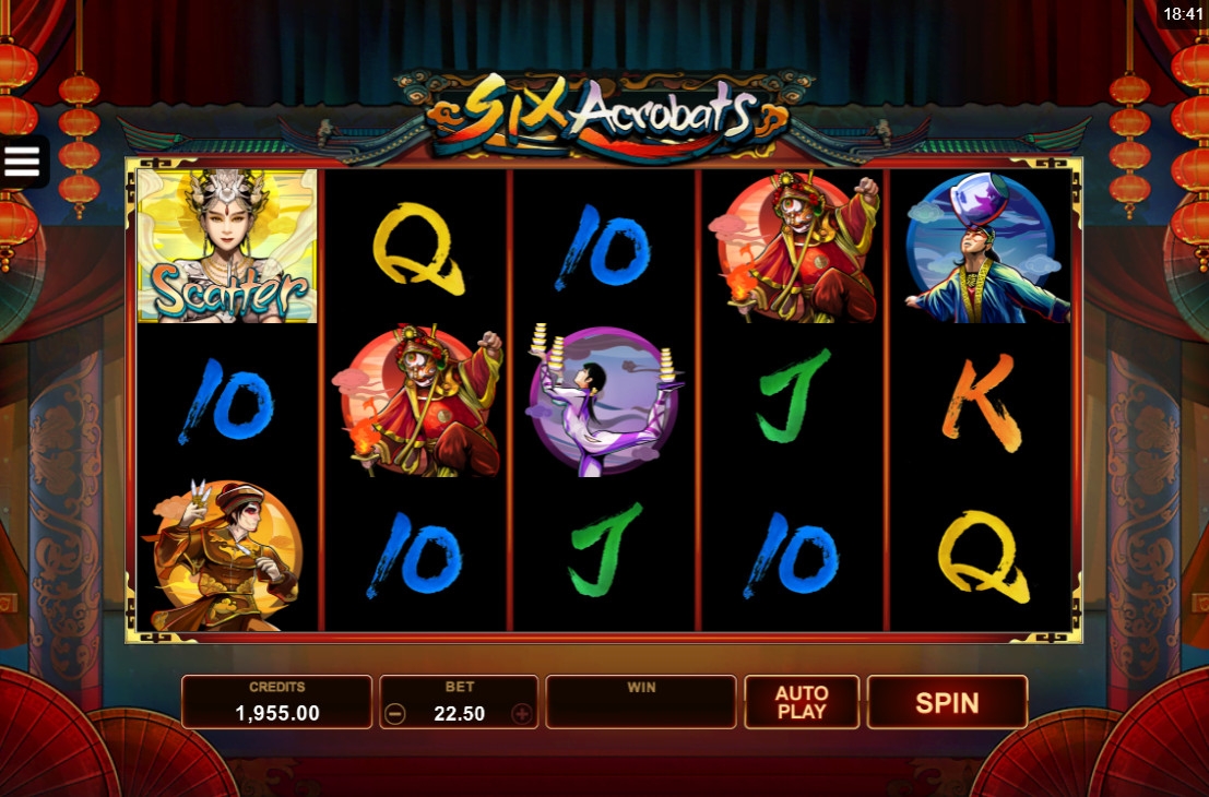 Невероятному мастерству китайских артистов цирка посвящен видео-слот Six Acrobats, доступный в онлайн-казино на платформе Quickfire (Microgaming).