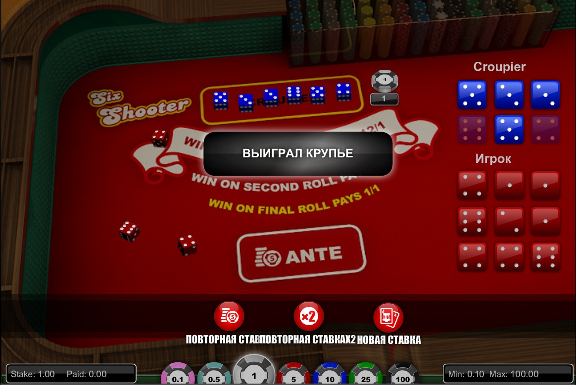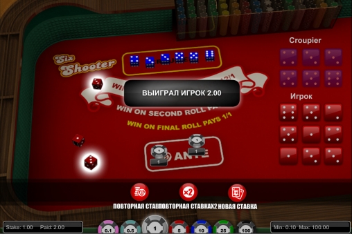 Есть возможность повторять ставки и удваивать их. Выброшенные дилером и игроком кости появляются справа от игрового поля. Размер ставки выбирается кликом по чипу нужного номинала (вы найдете их в нижней части экрана).