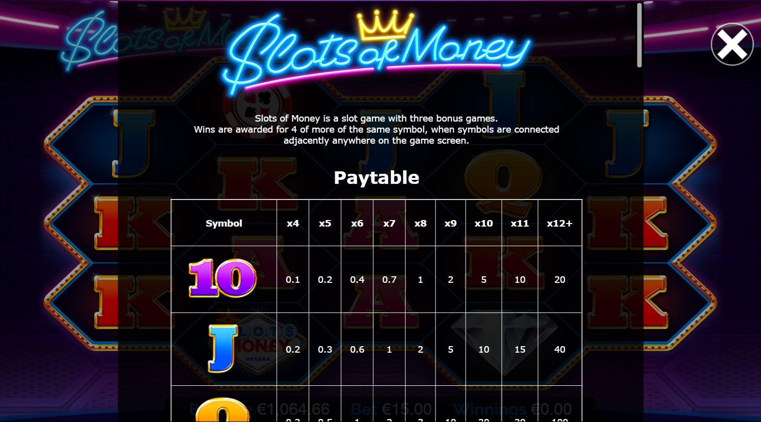 Видео-слот оформлен в стиле неоновой рекламы. На барабанах изображены разноцветные номиналы игральных карт, BAR, фишка с мастями, бриллиант и логотип Slots of Money Nevada, напоминающий знак Лас-Вегаса.