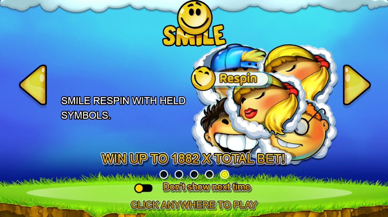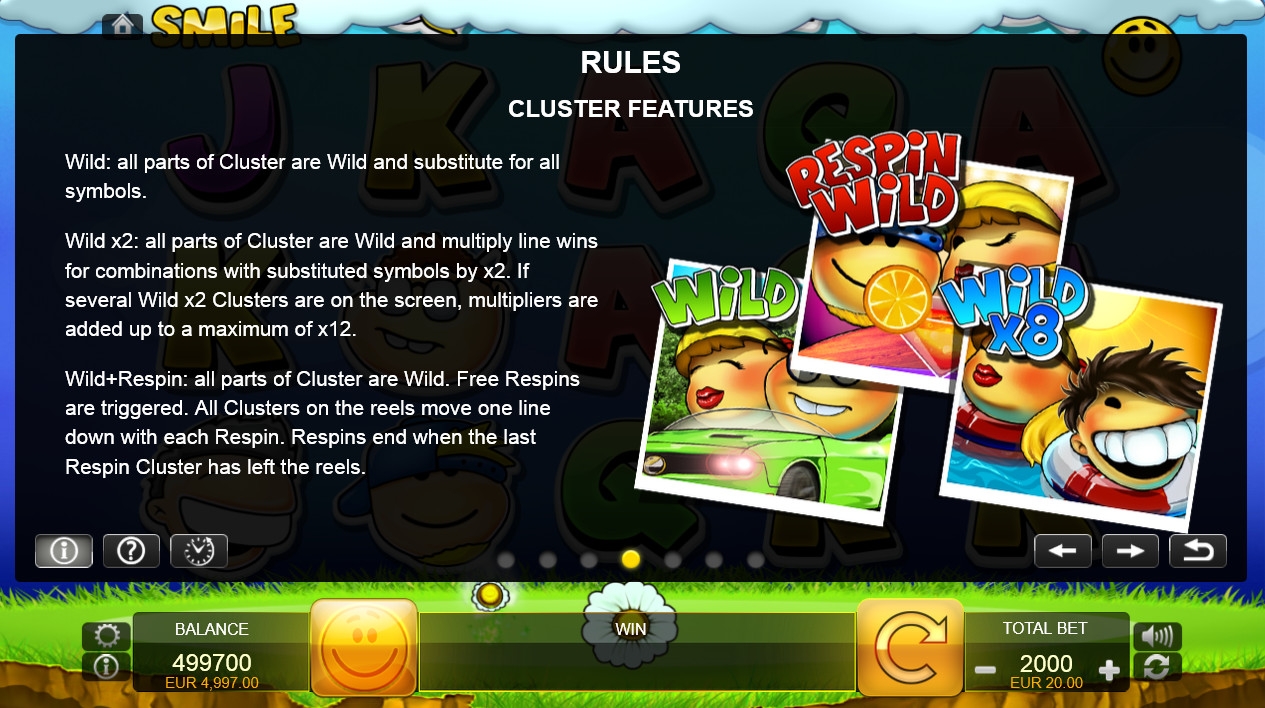- Smile Respin – Пять любых героев, не сложившихся в кластер, начинают повторное вращение. Оно также проходит на деньги заведения. Персонажи остаются на своих местах.