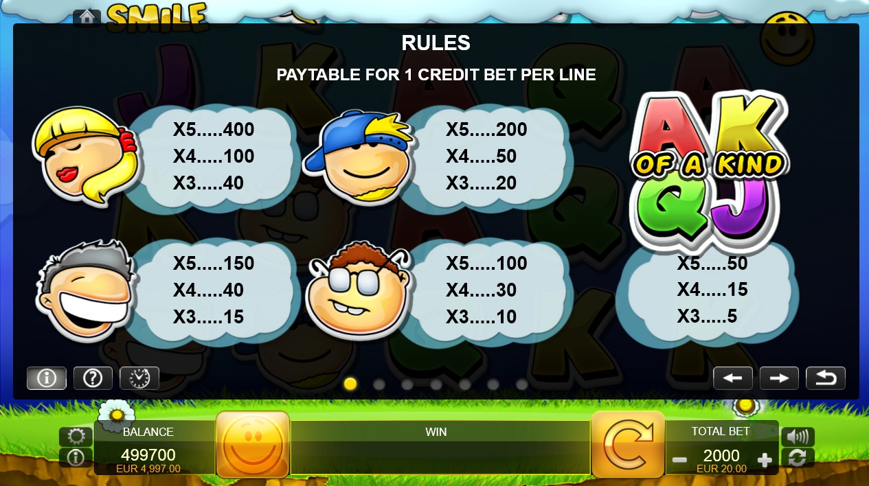 В игровом автомате Smile пять барабанов и двадцать линий. Количество активных полос не меняется. Символы выстраиваются на экране по сетке 5х3.