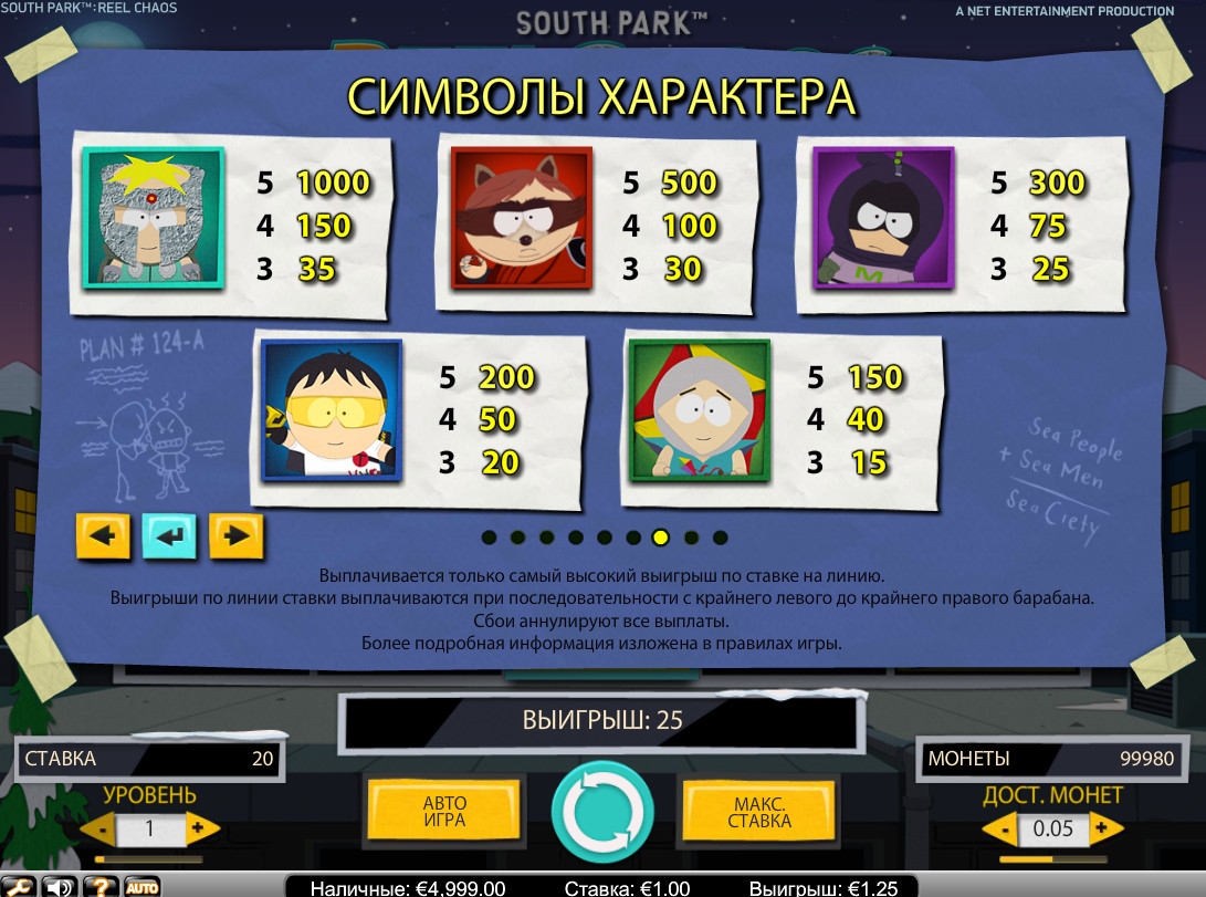 Безусловно, эта модель понравится поклонникам мультипликационного сериала «Южный парк», хотя мы рекомендовали бы протестировать ее даже тем, кто никогда его не смотрел. Игра действительно интересная, так как обладает многочисленными бонусными функциями. Мы уверены, что она вам понравится. К тому же, интерфейс полностью переведен на русский, играть можно без скачивания софта, а теоретический возврат довольно высокий.