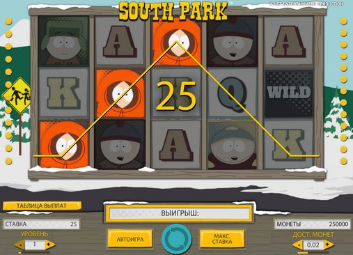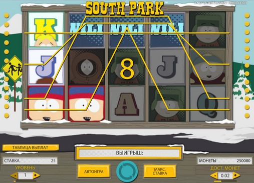 Выигрышные комбинации образуются в South Park по классическим правилам: несколько одинаковых изображений, идущих подряд на активной линии, начиная с первого барабана. Сумма выплаты зависит от ставки по линии, а также от коэффициента комбинации (максимальный множитель равен х750). Об исключениях из правил читайте ниже.