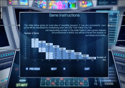 Сумма выигрыша зависит от количества отмеченных и совпавших номеров. Если угадать десять из десяти, выплата будет рассчитываться по коэффициенту х20 000. В правилах Space Keno есть специальная таблица, в которой указаны все возможные множители выигрышей.