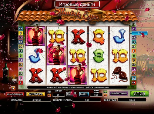 Spanish Eyes – бесплатный игровой автомат с пятью барабанами и тремя рядами картинок на экране. В данном видео-слоте есть особые символы, бесплатные спины, бонусный раунд, дополнительные множители, игра по шансам и другие функции.