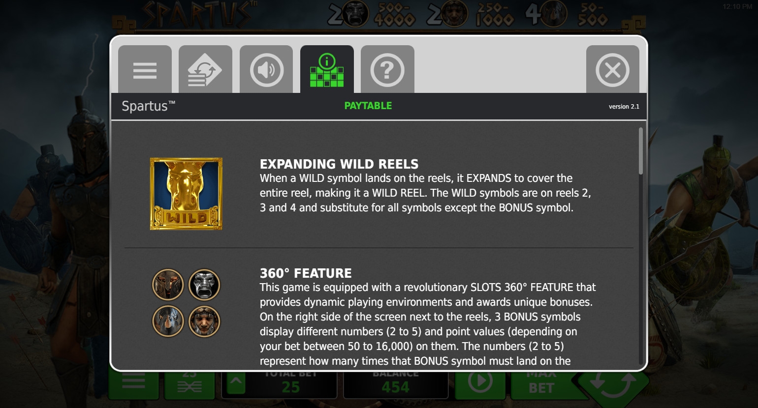 В меню есть разделы настроек, таблицы выплат, общих правил и параметров автоигры. Вы не будете скачивать слот «Спарта», ведь он запускается в браузере.