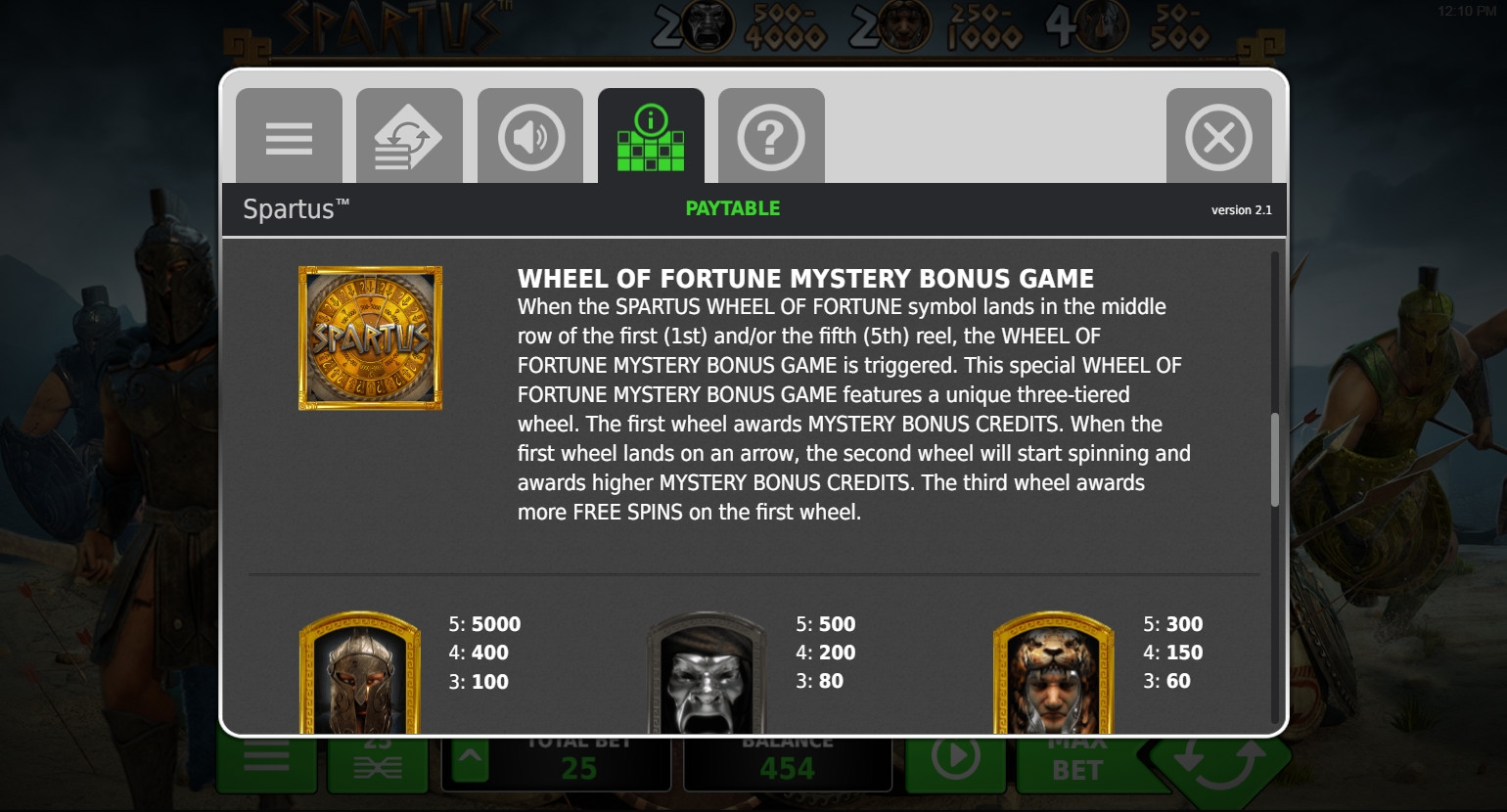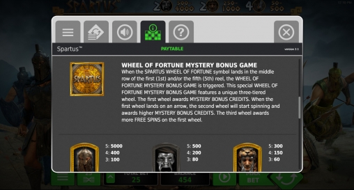 - Bonus (логотип Spartus) изображен на первом и последнем барабанах. Когда он оказывается в средней ячейке первой и/или пятой колонок, запускается бонусная игра Wheel of Fortune Mystery.