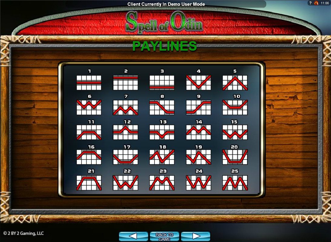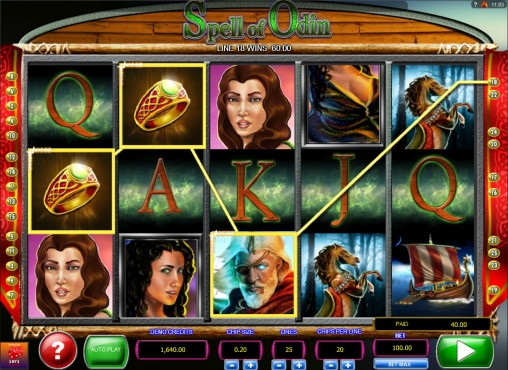 В Spell of Odin пять барабанов и двадцать пять активных линий. Можно играть на игровом автомате, задействовав любое их количество. Ставка на каждую позицию может достигать двадцати монет номиналом от одного до двадцати центов. Таким образом, на раунд принимается до ста евро.