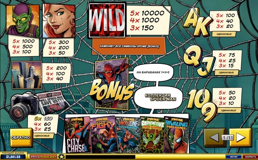 Так как видео-слот Spider-Man – Attack of the Green Goblin полностью русифицирован, нет необходимости подробно останавливаться на описании его интерфейса и объяснении функций, которые выполняют различные кнопки на панели управления.