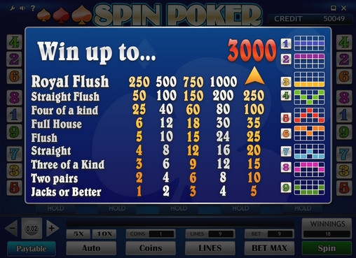 Главная особенность Spin Poker – это интерфейс в стиле видео-слота. Играть в видео-покер можно по одной – девяти линиям. На каждую из них принимается ставка в одну – пять монет номиналом от двух центов до двух евро. Следовательно, на один раунд можно поставить от двух центов до девяноста евро.