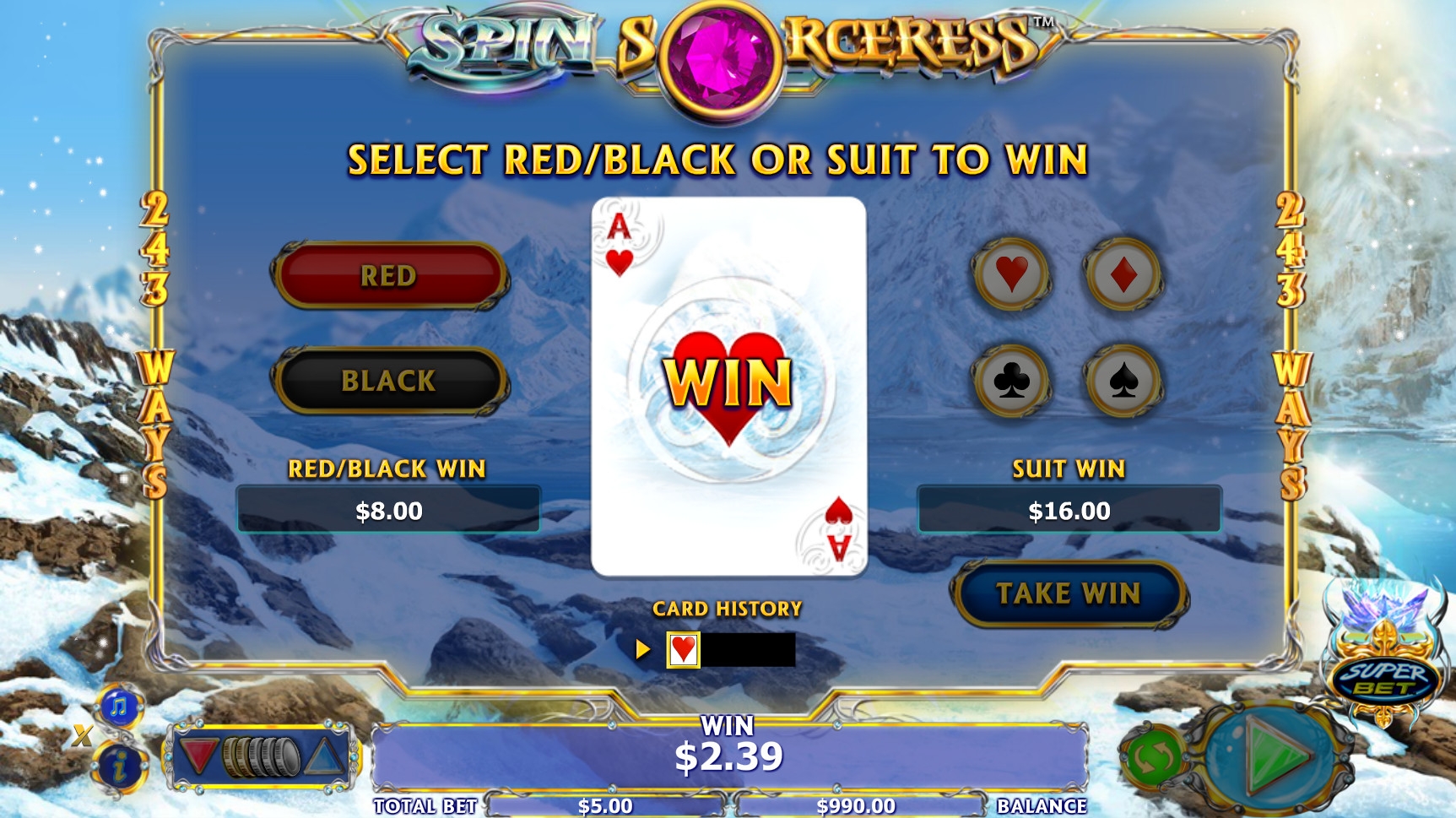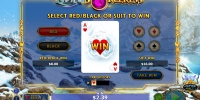 Если хотите, вы можете сразу не забирать деньги, а запустить риск-игру. На отдельном экране появится закрытая карта. Вам нужно угадать ее цвет или масть. Правильно названный цвет удваивает выплату. Верно определенная масть увеличивает ее в четыре раза. В одном подходе можно играть до пяти раз кряду, но при первой же ошибке вы лишитесь денег.