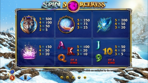В Spin Sorceress используется не так уж много символов, но все картинки очень красивые. Вы увидите мощного волка, магическую сферу на руке колдуньи, волшебный жезл, сияющую линию, а также блестящие буквы и цифры разных цветов, означающие номиналы карт от девятки до туза.