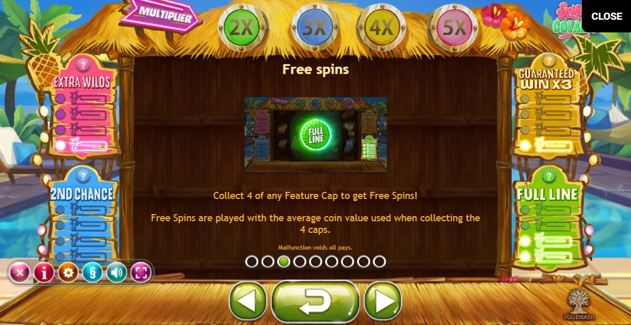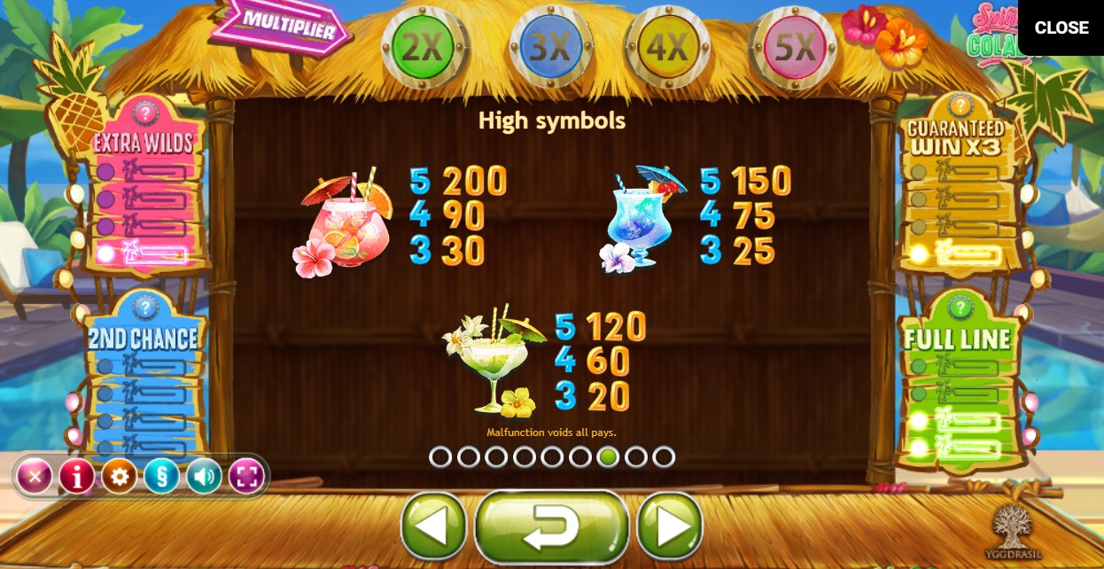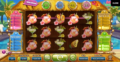 В игровом автомате «Спина-колада» пять барабанов и двадцать пять постоянно используемых линий. На них принимаются равные ставки в диапазоне от одного цента до пяти евро (0.25 – 125 евро на раунд).
