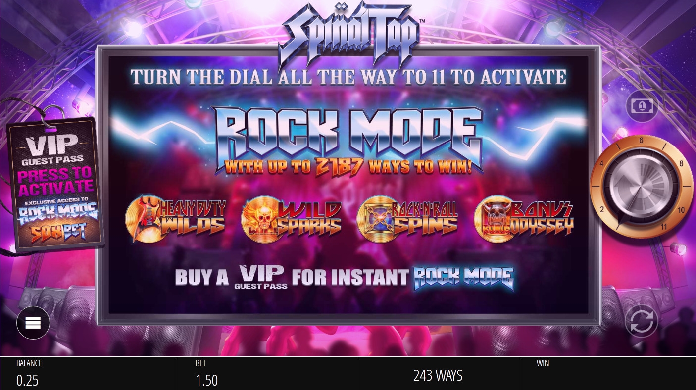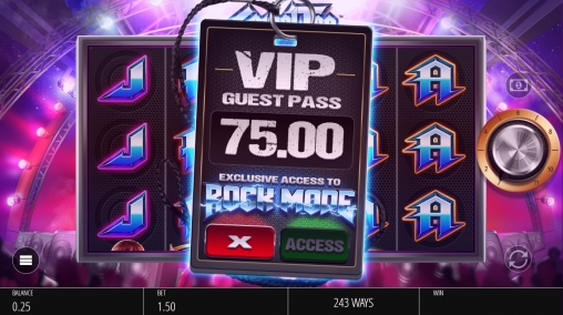 - Rock Mode – Чтобы активировать данный режим, нужно купить VIP-билет. Его стоимость – пятьдесят условных монет на спин (вместо тридцати в базовых розыгрышах). Также можно включить его, если повернуть регулятор громкости на одиннадцать. Здесь появятся два дополнительных барабана, благодаря чему количество доступных комбинаций возрастает до 2187.