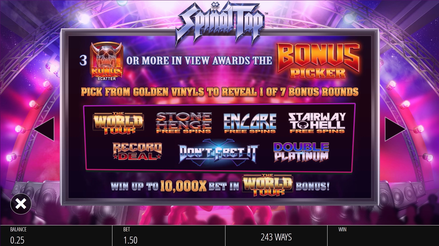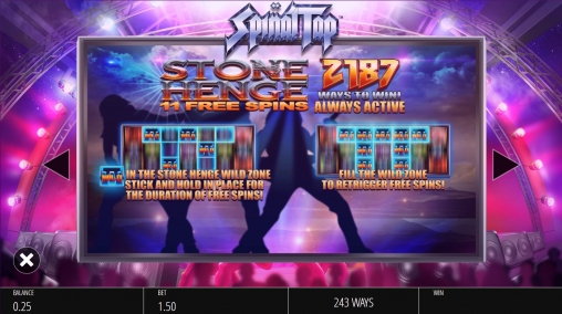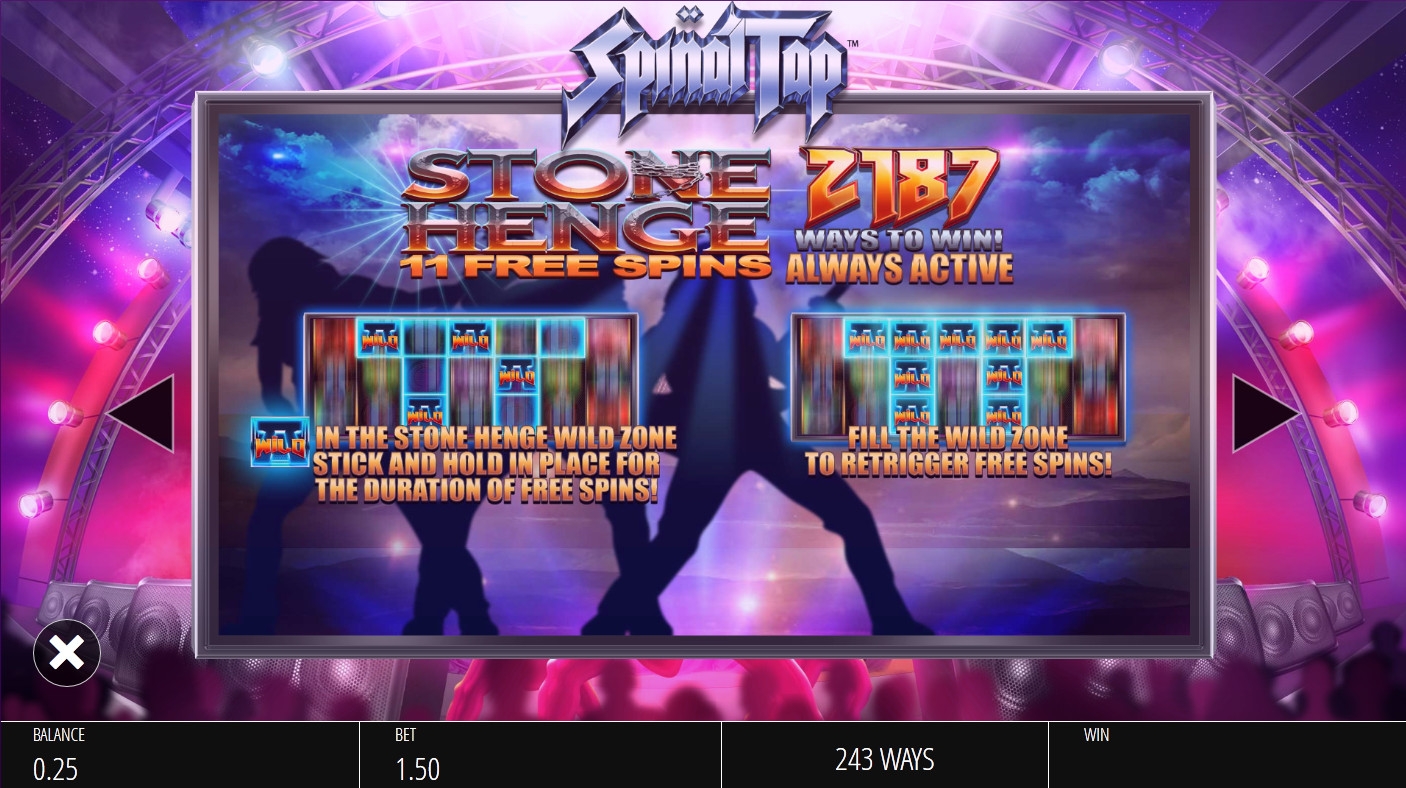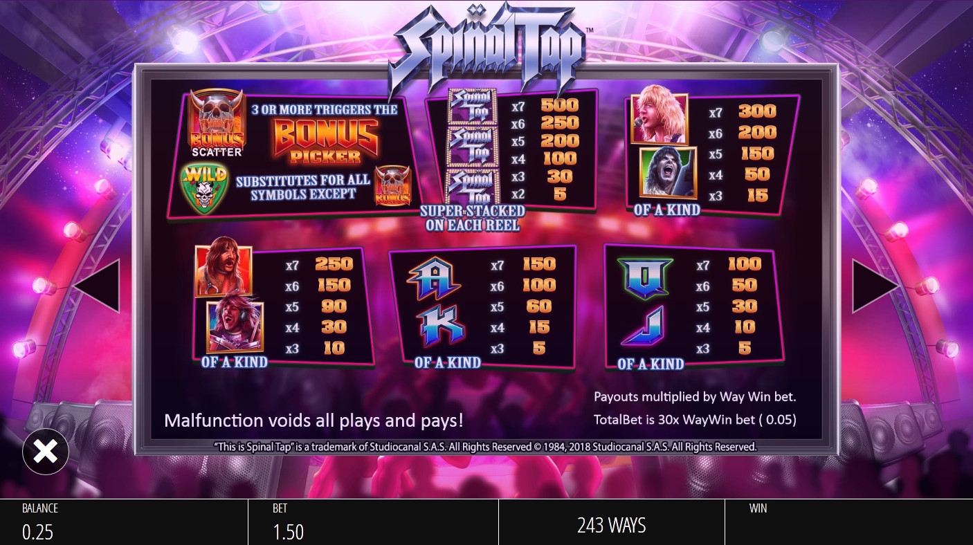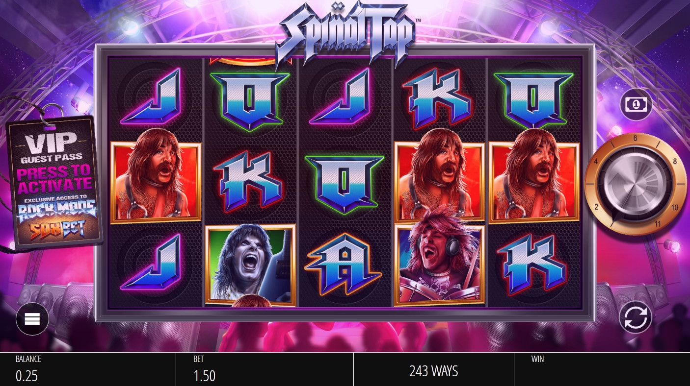 В базовом режиме игры видео-слот Spinal Tap имеет пять барабанов, пятнадцать картинок на главном экране и 243 способа формирования комбинаций без активных линий.