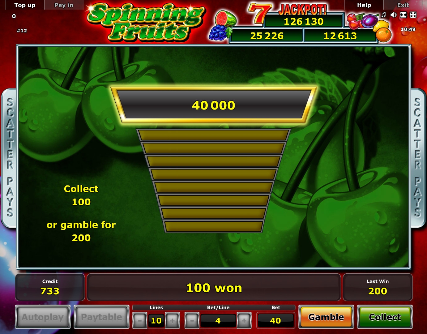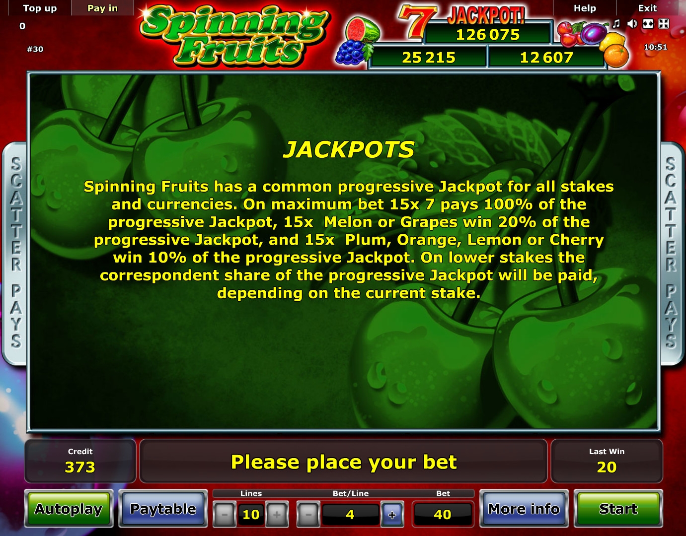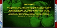 В Spinning Fruits разыгрывается многоуровневый прогрессивный джекпот. Он увеличивается благодаря отчислениям некоторой части всех ставок пользователей, сделанных настоящими деньгами.