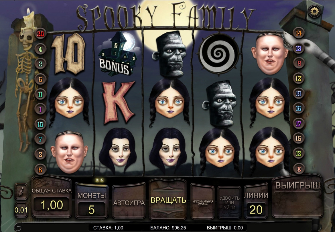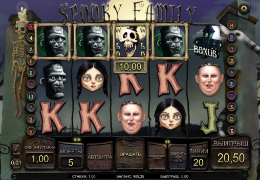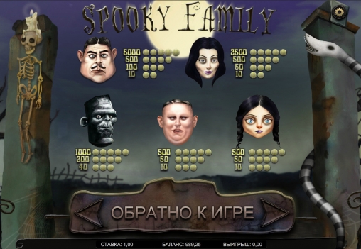 Spooky Family - отличный игровой автомат с классной графикой и хорошо подобранным музыкальным сопровождением! В видео-слоте «Зловещая семейка» есть два призовых раунда Family Pet и Random Bonus! Рекомендую!