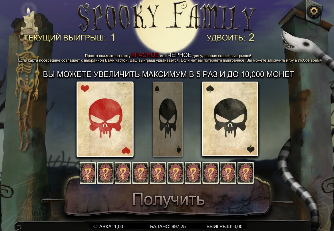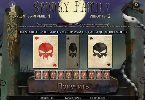 Мы не будем подробно описывать особенности интерфейса видео-слота Spooky Family, потому что он полностью переведен на русский язык. Это даст вам возможность быстро во всем разобраться.