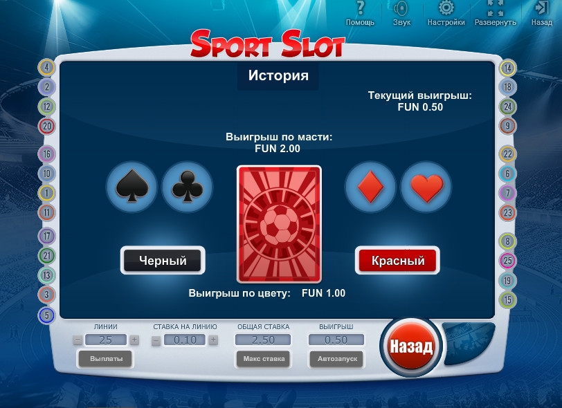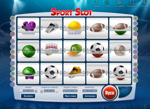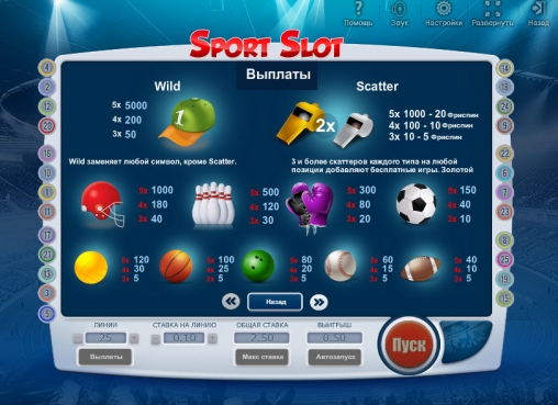 Играть на игровом автомате Sport Slot можно по любому количеству активных линий вплоть до двадцати пяти. На линию принимается ставка в диапазоне от десяти центов до одного евро, а на спин можно ставить не более двадцати пяти евро.
