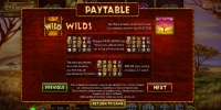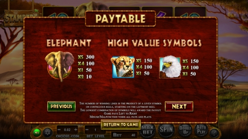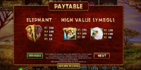 видео-аппарата появляются карточные номиналы, украшенные африканскими орнаментами, и дикие животные: антилопы, зебры, жирафы, орлы, гепарды и слоны. Вертикальными стеками на барабанах появляются изображения слонов.