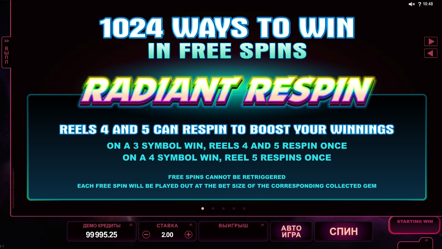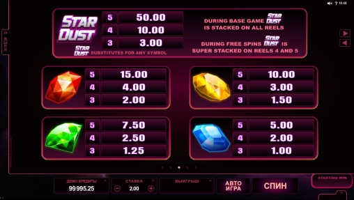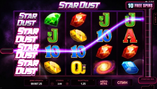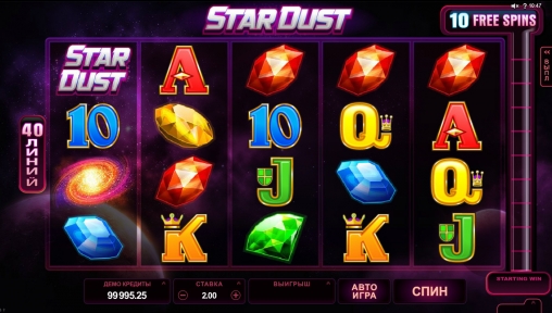 Межзвездная пыль интересный видео-слот космической тематики с красивыми иконками в виде драгоценных камней. Здесь нет прогрессивного джек-пота и бонусной игры. Можно играть бесплатно.