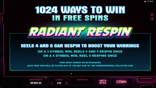 Спинов может быть до тринадцати. В них комбинации формируются без учета линий 1024 способами. Одинаковые картинки просто должны выпасть на соседних барабанах, включая первую колонку. Здесь также доступны бесплатные респины, которые стартуют при образовании выигрышных цепочек.