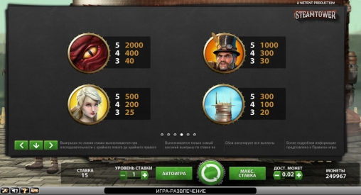 Выплаты в Steam Tower начисляются за собранные на активных линиях комбинации. Таковыми считаются непрерывные последовательности одинаковых элементов, начинающиеся с первого барабана слева. При этом на одной полосе выигрыш начисляется лишь за самую длинную цепочку, хотя на разных позициях в одном спине может быть несколько выигрышей. Исключением из общих правил является скаттер, о котором читайте ниже.