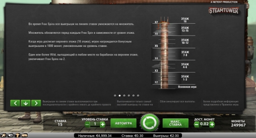 «Паровая башня» - это 5-барабанный слот с пятнадцатью постоянно задействованными линиями. На каждую из них принимается до десяти монет (ставки по всем позициям обязательно одинаковые) номиналом от одного цента до одного евро (на примере Unibet). Таким образом, разрешается играть на игровом автомате по максимальной ставке сто пятьдесят евро.