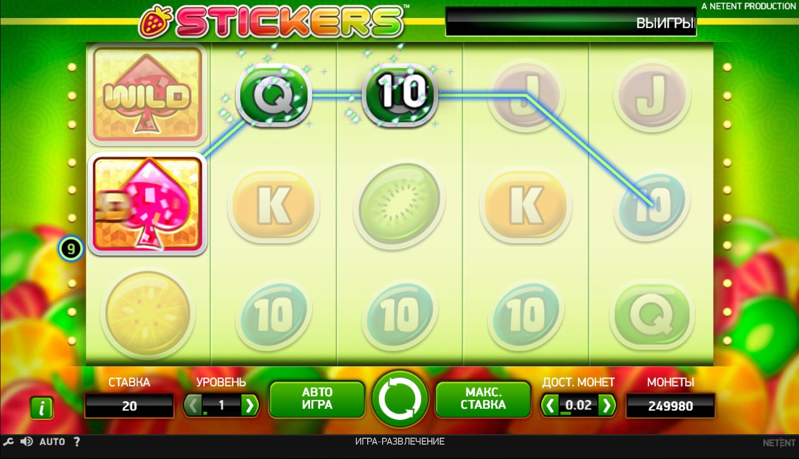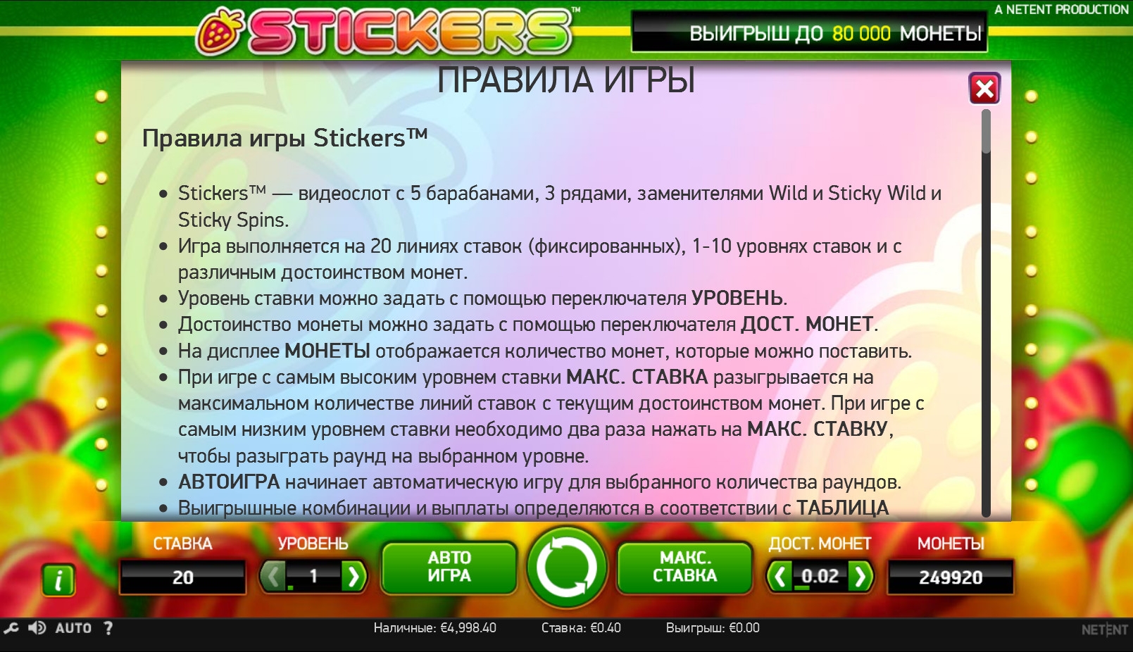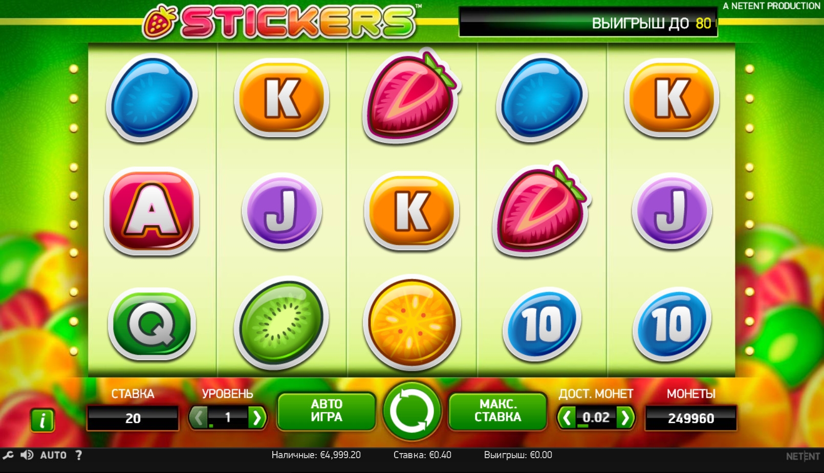 Скачивать видео-слот Stickers не нужно. Он, как и все модели этого бренда, запускается в интернет-браузере на сайте казино.