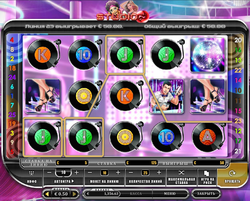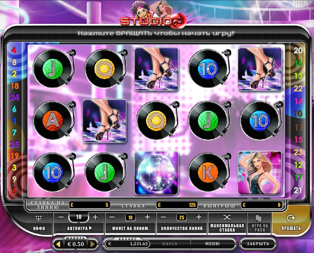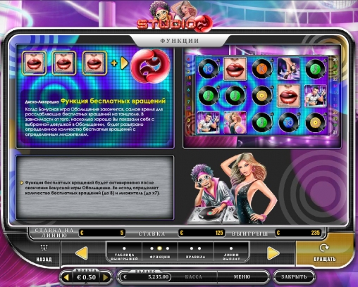В Studio 69 пять барабанов, двадцать пять линий и пятнадцать изображений на главном экране. Разрешается включать любое количество активных полос, сделав по ним равные ставки.