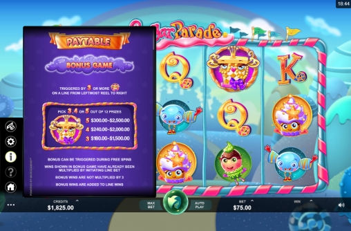 Перечень доступных в Sugar Parade функций состоит из базовых картинок, бонусных символов, джокеров, скаттеров, фри-спинов, призовых выплат и дополнительных множителей.
