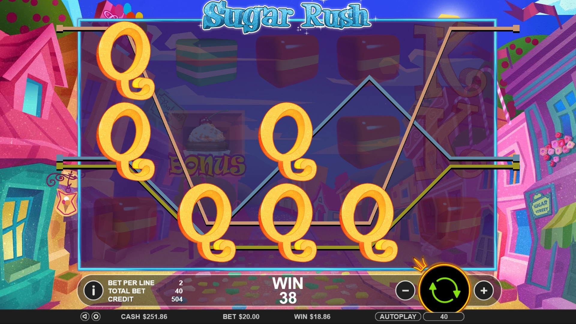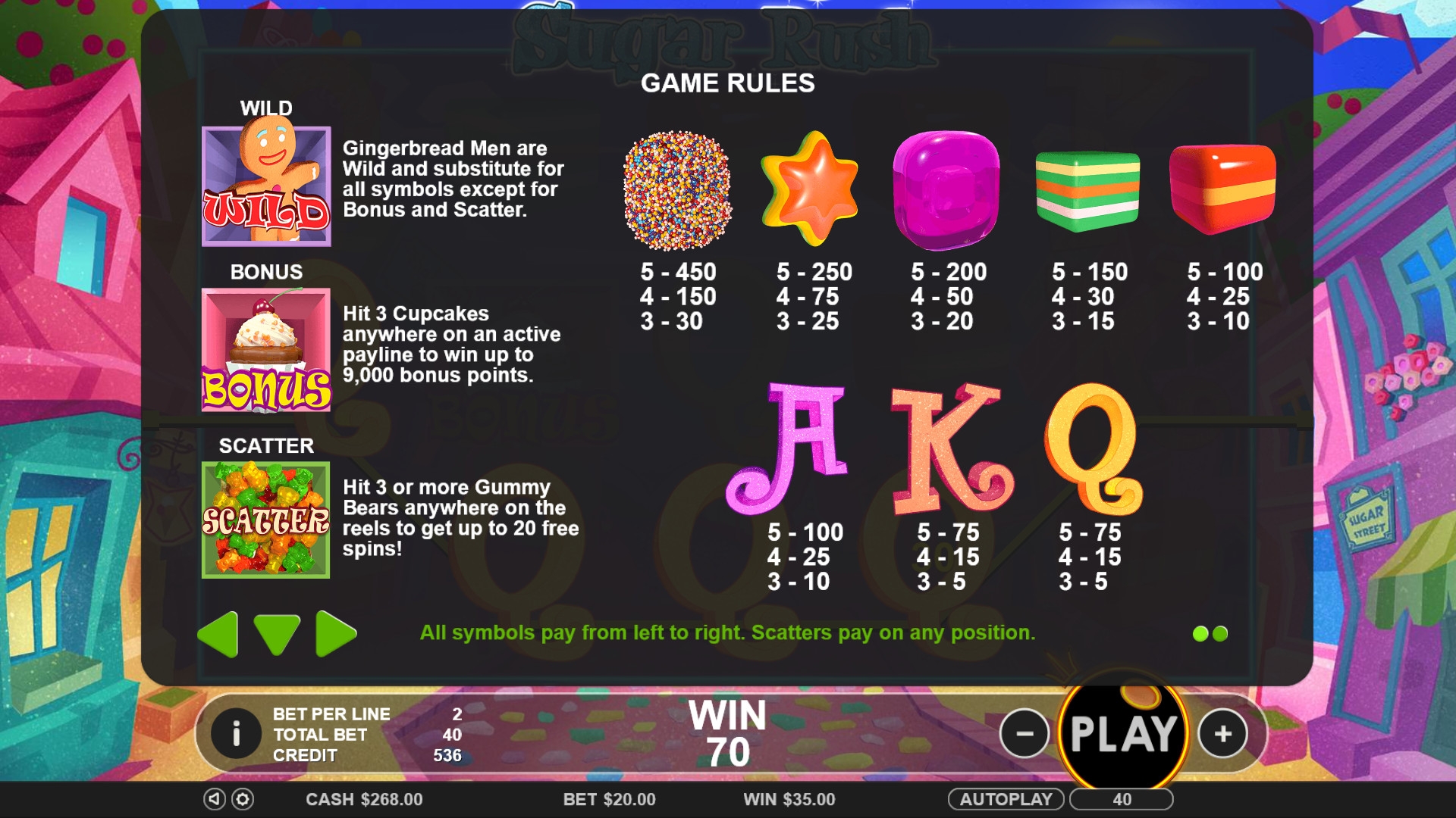 Конечно, на экране слота появляются различные сладости: леденцы, пирожные, конфеты и так далее. Еще здесь используются буквы Q, K, A. Все картинки могут выпадать в колонках длинными полосами занимая все три ячейки по вертикали.