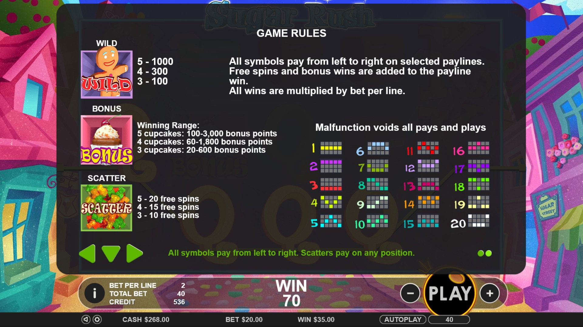 Сладкий вышел автомат, но если отвлечься от конфетной тематики, то что в нем самое необычное - система формирования призовых линий, такое совсем не ожидаешь от стандартного на вид 20-ти линейного слота. Так что попробовать точно стоит.