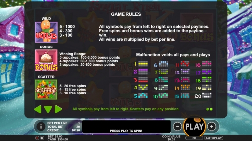 - Bonus (пирожное с вишенкой) дает право на участие в призовом раунде, когда хотя бы три символа выпадают где-нибудь на экране.