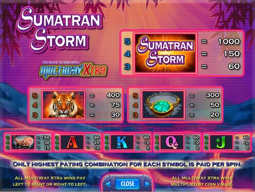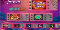 Sumatran Storm – пятибарабанный видео-слот с необычным расположением картинок на экране. На первом и пятом барабане выпадает по три картинки, на втором и четвертом – по четыре, а на третьем – пять. Играть на игровом автомате можно только по шестидесяти монетам номиналом от одного до ста кредитов. На спин принимается ставка до шести тысяч кредитов.