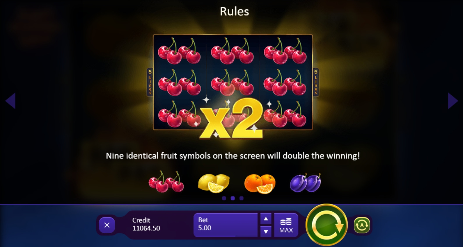 - Х2 - Если одинаковые картинки занимают девять ячеек на экране, выплаты по всем пяти комбинациям рассчитываются по удвоенным коэффициентам.
