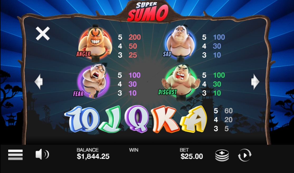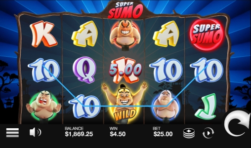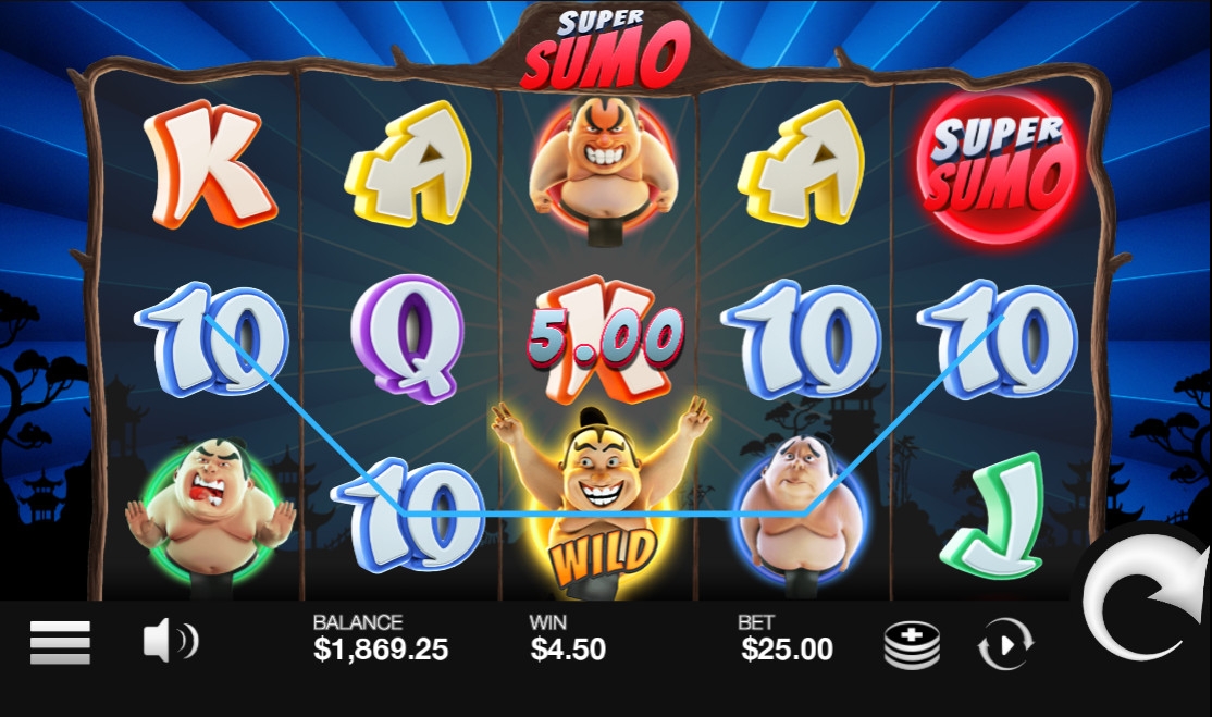В видео-слоте «Супер-сумо» пять барабанов, двадцать пять активных линий и пятнадцать ячеек на основном экране.