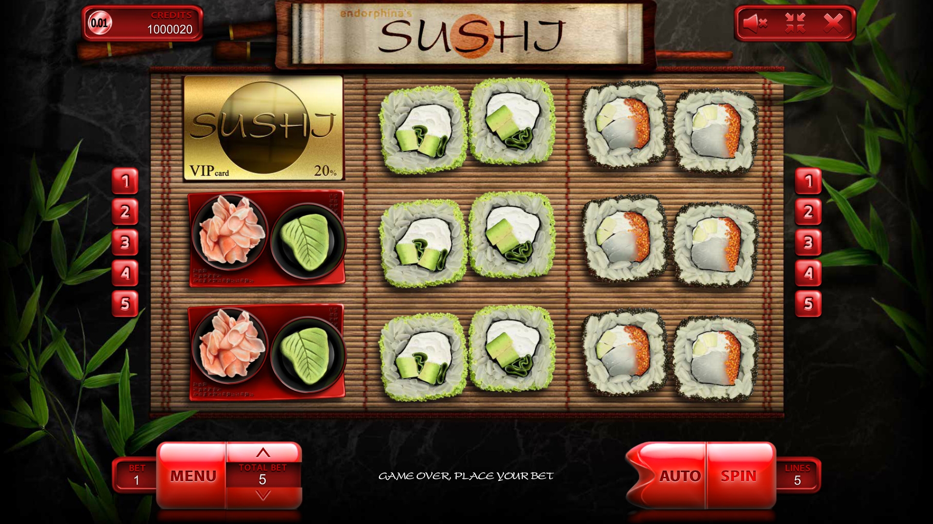 Sushi является слотом с тремя барабанами, на которых изображены различные тематические картинки. Предусмотрены пять линий для формирования на них выигрышных комбинаций из одинаковых изображений. Вы можете задействовать от одной до пяти полос. На них принимаются равные ставки.