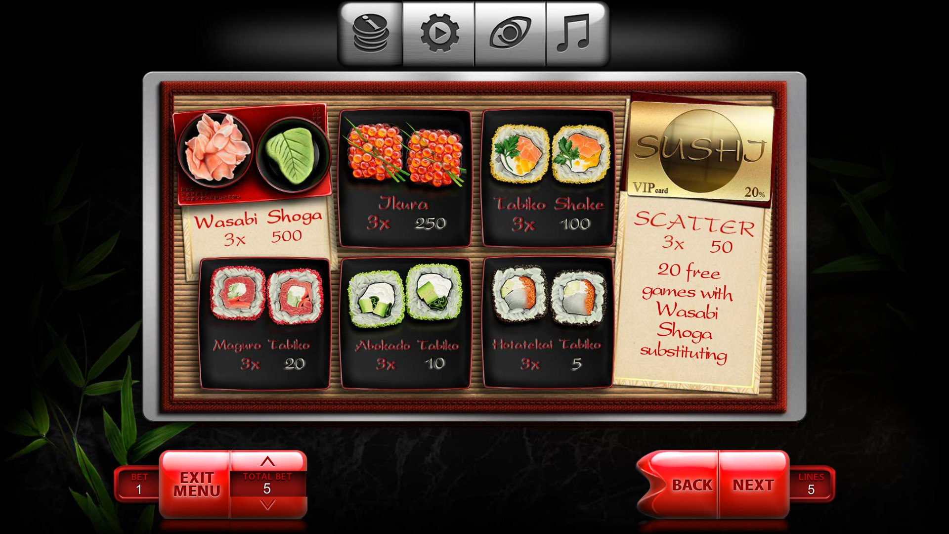 Отнюдь не сложно догадаться, что нарисовано на барабанах автомата. Конечно, вы увидите различные виды знаменитого блюда. Преимущественно это роллы, но есть также суси, васаби в виде листочка и маринованный имбирь розового цвета.