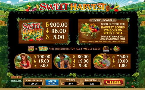 Надо сказать, создатели видео-слота Sweet Harvest насколько живописно изобразили процесс уборки урожая, что, кажется, чувствует аромат свежих фруктов и овощей, изображенных на барабанах игрового автомата. Кроме того, на экране появляются фермеры и обозначения номиналов игральных карт от десятки до туза.