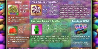 На экране видео-слота Sweet Success появляются различные сладости, а также выполненные в виде конфет номиналы игральных карт от десятки до туза. Еще в игре используются специальные символы Wild, Free Spins, Feature Game и Scatter. Они подписаны, поэтому вы их легко узнаете. Рассмотрим особенности данных картинок: