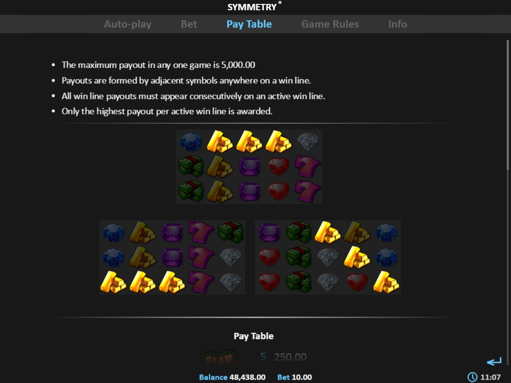 Регулировать в Symmetry можно звук, размер экрана и настройки автоматического режима. Открывается видео-слот непосредственно в интернет-браузере.