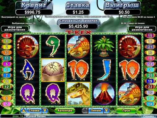 Игровой аппарат «Тираннозавр» (T-Rex) является бесплатным онлайн-автоматом. В нем имеются пять игровых барабанов и двадцать пять линий, которые доступны для игровых раундов.