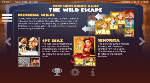 В этих вращениях на барабанах появляются изображения капитана Диаса и прекрасной сеньориты. Братья по одному выпадают на пятом барабане, выпуская так называемые Running Wild («бегущие дикие символы»). Другими словами, они сбегают из тюрьмы, а эти элементы рассыпаются по барабанам, заменяя прочие картинки.