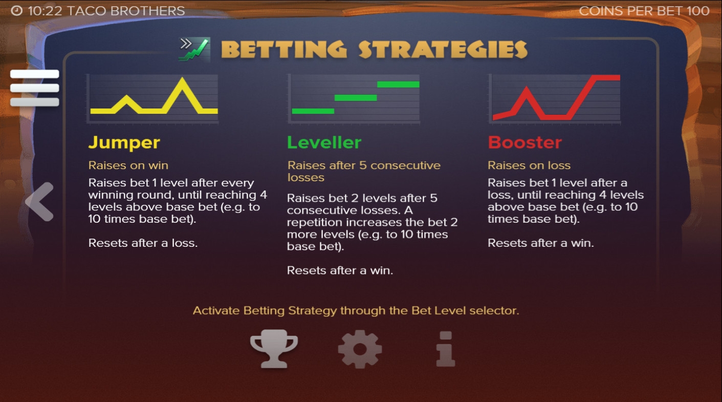 В окне для выбора ставки также есть возможность задействовать одну из трех стратегий. Это системы автоматического изменения суммы на кону в зависимости от игровой ситуации. С ними вы сможете ознакомиться самостоятельно, тестируя игру в бесплатном режиме.